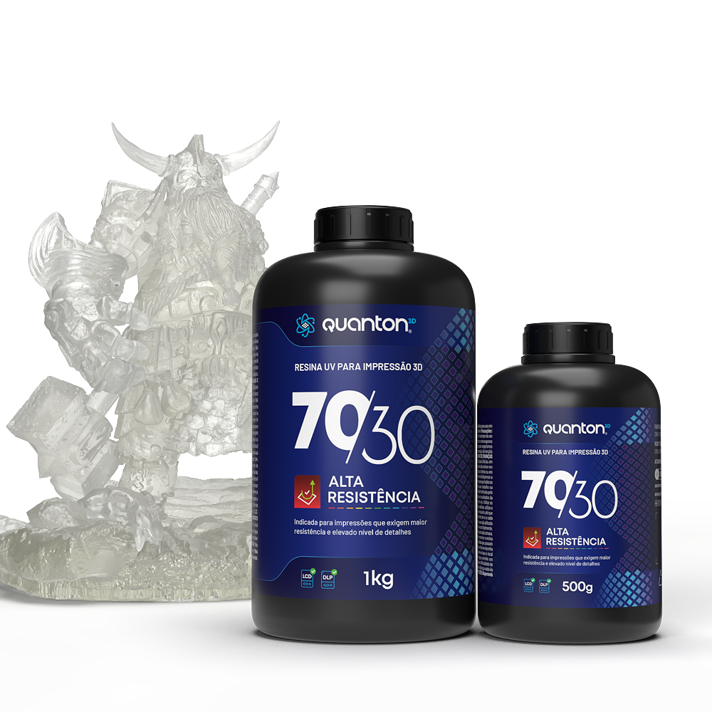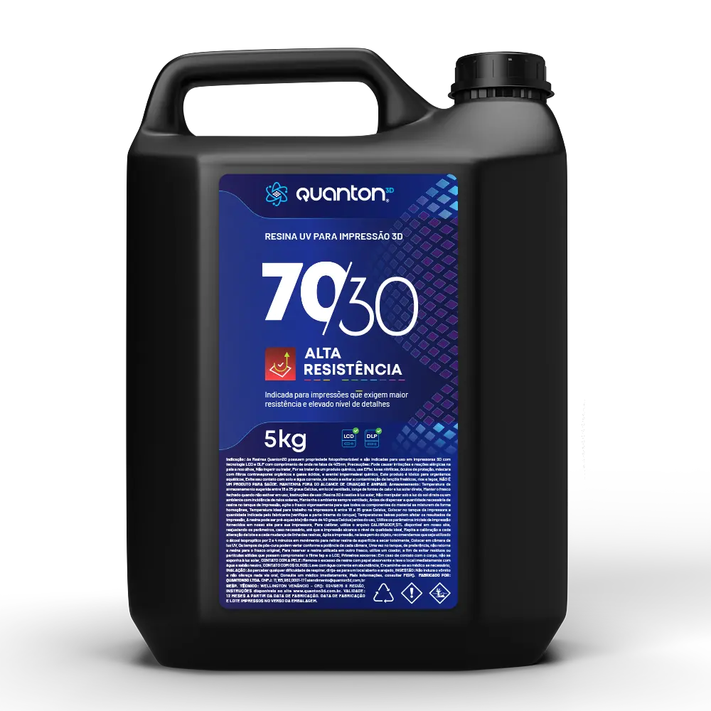 As Resinas Quanton3D são fotopolimerizáveis e projetadas para impressoras 3D LCD e DLP com comprimento de onda entre 395 – 405nm. A linha 70/30 destaca-se por sua combinação equilibrada de flexibilidade e resistência, proporcionando detalhes precisos e acabamento de qualidade superior. É ideal para a criação de protótipos e peças que exigem durabilidade, como componentes flexíveis. No entanto, não é recomendada para a fabricação de peças com estruturas finas e suspensas, como asas de dragões, devido à sua composição específica. Devido à natureza química da resina, o uso de Equipamentos de Proteção Individual (EPI) é essencial para garantir a segurança durante o manuseio. A Resina 70/30 da Quanton3D é uma escolha excelente para quem busca resultados de alta precisão e confiabilidade em impressões 3D.