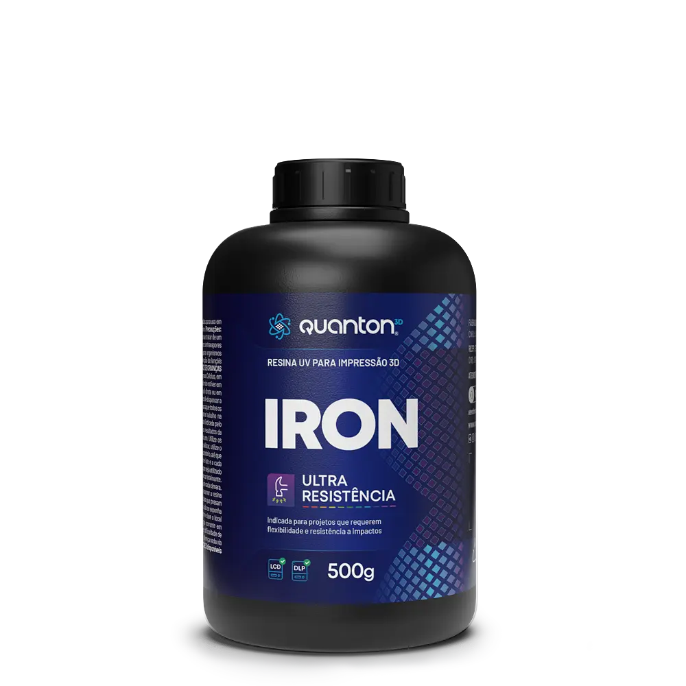 As Resinas Quanton3D são fotopolimerizáveis e projetadas para impressoras 3D LCD e DLP com comprimento de onda entre 395 – 405nm. A linha Iron é adequada para projetos que exigem flexibilidade e resistência a impactos em peças acima de 2mm (abaixo pode gerar flexibilidade). Devido à sua composição, não é recomendada para peças inclinadas e tem baixa resistência a água.