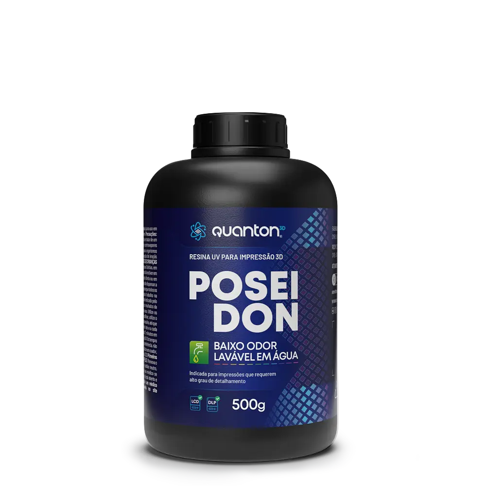 As Resinas Quanton3D são fotopolimerizáveis e projetadas para impressoras 3D LCD e DLP com comprimento de onda entre 395 – 405nm. A linha Poseidon, que dispensa álcool para limpeza, é rígida com leve flexibilidade, oferecendo detalhamento preciso, baixo odor e versatilidade para várias impressoras 3D. Ideal para protótipos, miniaturas, peças funcionais e decoração, requer uso de EPIs e não é biocompatível. Embora lavável em água, ainda apresenta toxicidade.