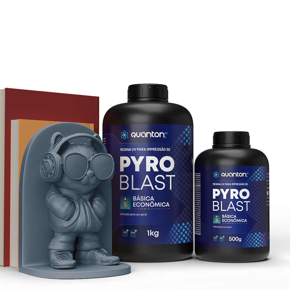 As Resinas Quanton3D são fotopolimerizáveis e projetadas para impressoras 3D LCD e DLP com comprimento de onda entre 395 – 405nm. A linha Pyroblast é ideal para iniciantes e usuários avançados, essa resina oferece alta precisão, resistência e fluidez, sendo perfeita para a produção de peças decorativas, artísticas e protótipos. Seu odor é moderado e o uso de Equipamentos de Proteção Individual (EPIs) é recomendado durante o manuseio.