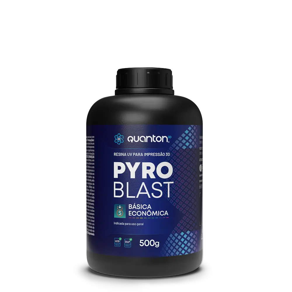 As Resinas Quanton3D são fotopolimerizáveis e projetadas para impressoras 3D LCD e DLP com comprimento de onda entre 395 – 405nm. A linha Pyroblast é ideal para iniciantes e usuários avançados, essa resina oferece alta precisão, resistência e fluidez, sendo perfeita para a produção de peças decorativas, artísticas e protótipos. Seu odor é moderado e o uso de Equipamentos de Proteção Individual (EPIs) é recomendado durante o manuseio.